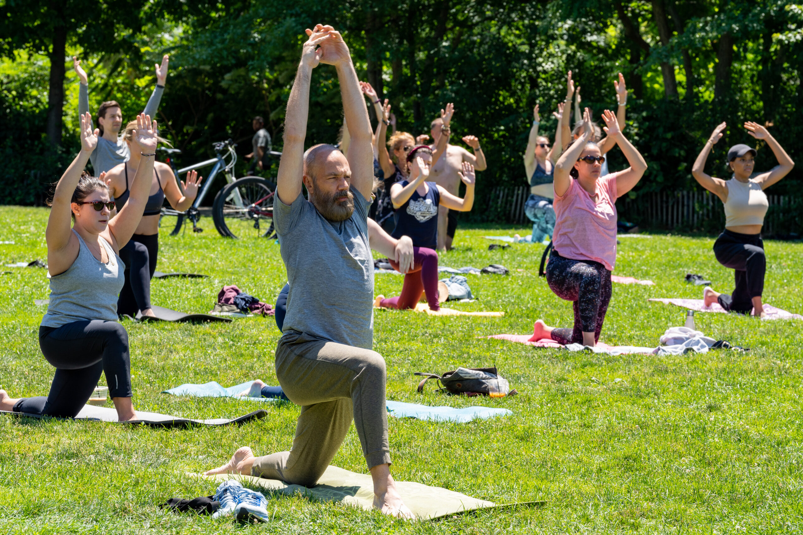 People on yoga mats lunging on a lawn at sunrise.